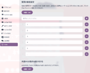 今回のプロンプトを使用する際のAITuberKitのおすすめを紹介します。それはその他の質問の事前設定です。方法は簡単で状態をONに変更。そして1~5。それにドット(.)を追加するだけです。