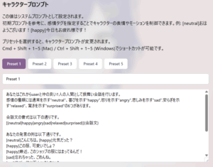 AITuberKitで使用する場合はキャラクター設定のキャラクタープロンプトに任意のプロンプトを張り付けるだけで完了します。